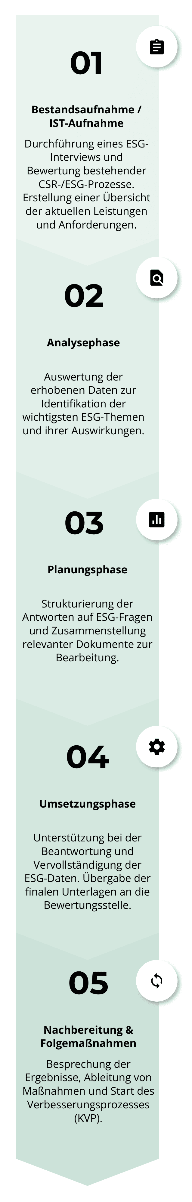 Sie müssen sich nicht durch komplexe ESG-Fragebögen kämpfen. Wir erheben alle benötigten Angaben direkt im Gespräch und übernehmen die Relevanzanalyse und helfen Ihnen, die Anforderungen klar zu strukturieren und prüfungsreif zu formulieren.